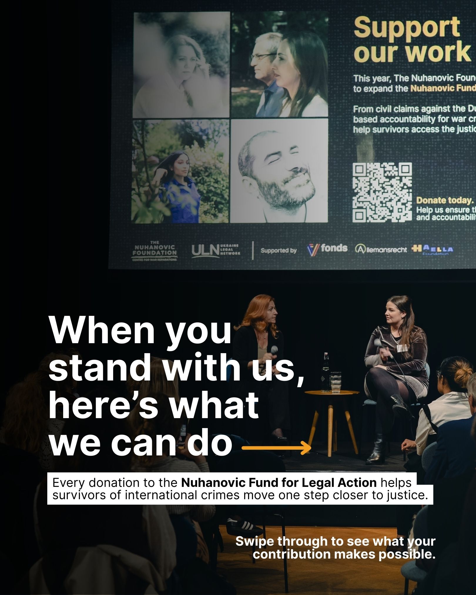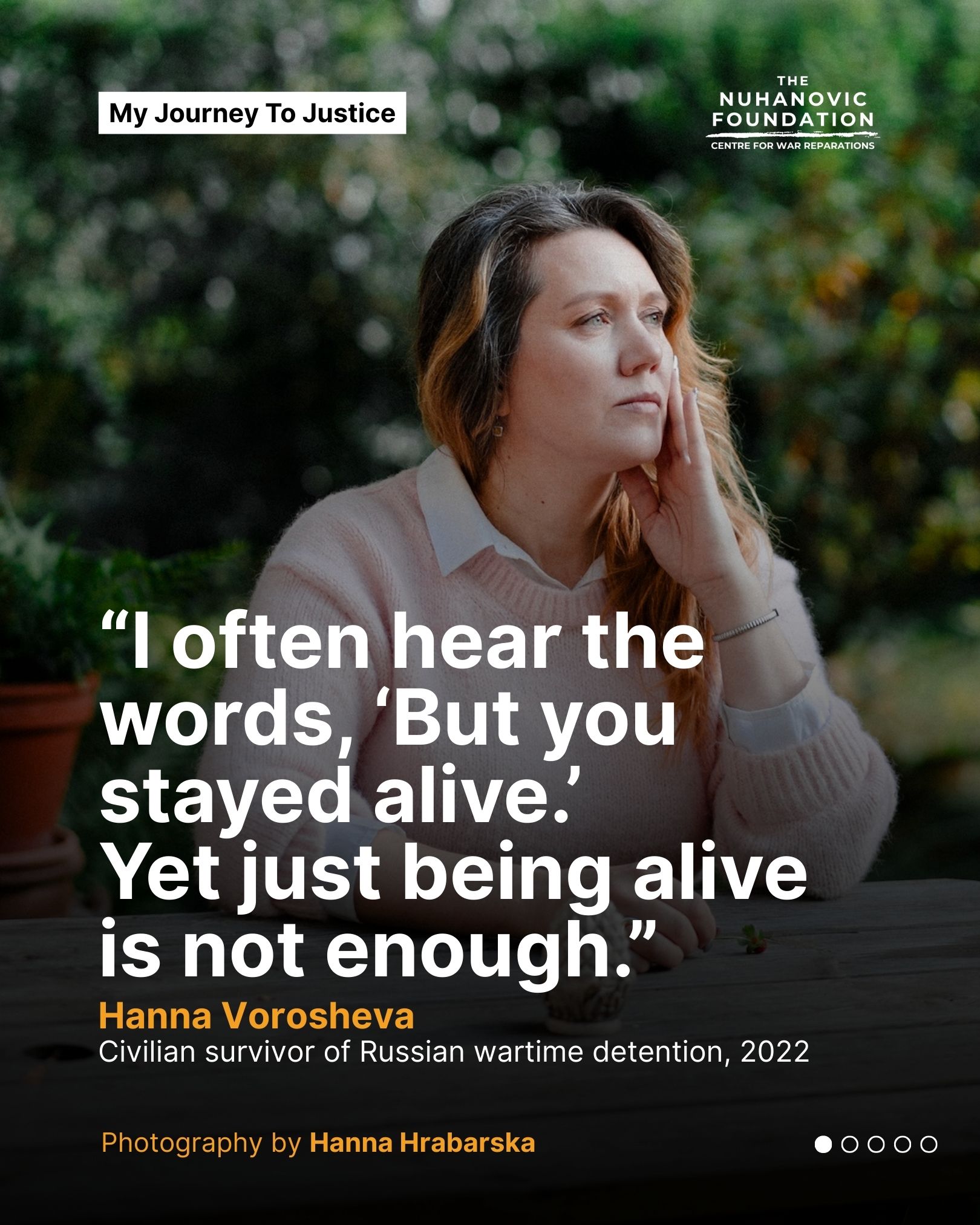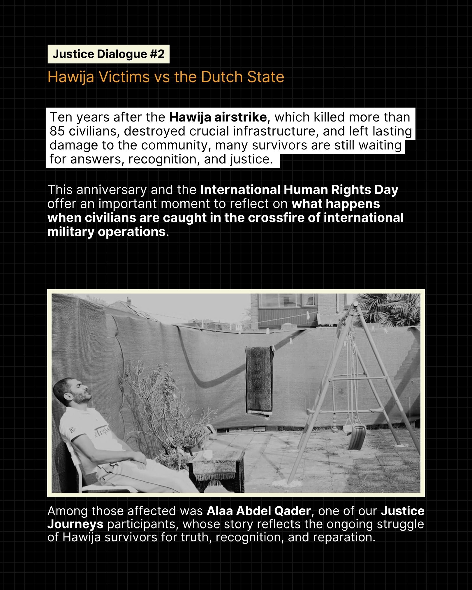 Justice: From War to Democracy & Freedom is a global storytelling, awareness-raising, and fundraising campaign that explores pathways from conflict and authoritarianism toward justice, accountability, and reparation. The campaign brings together powerful narratives of resilience by showcasing the stories of four survivors of international crimes, coupled with a clear call to action to mobilise public engagement and financial support for justice-focused initiatives.
